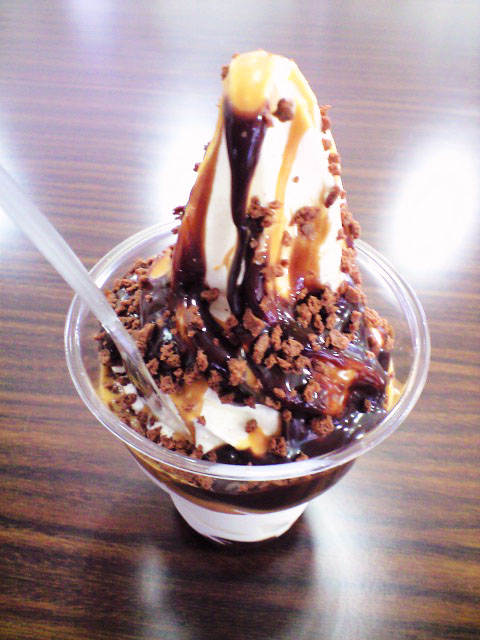 ソフトクリームの上にはチョコソースとキャラメルソース。