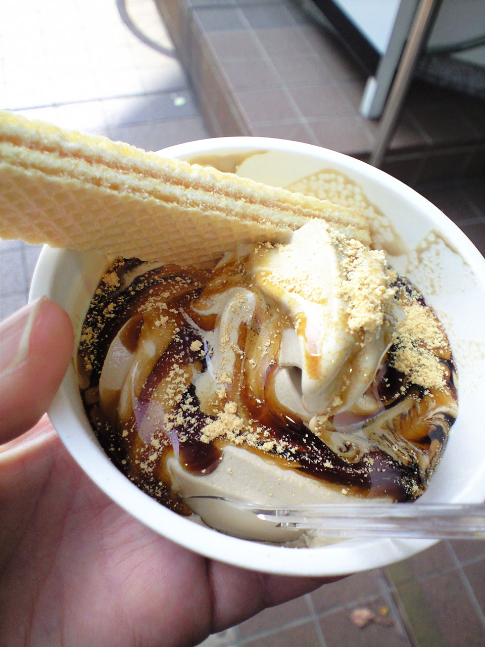 サンデーもそれぞれ3種類あり、今回はほうじ茶ソフト×黒蜜を選びました。