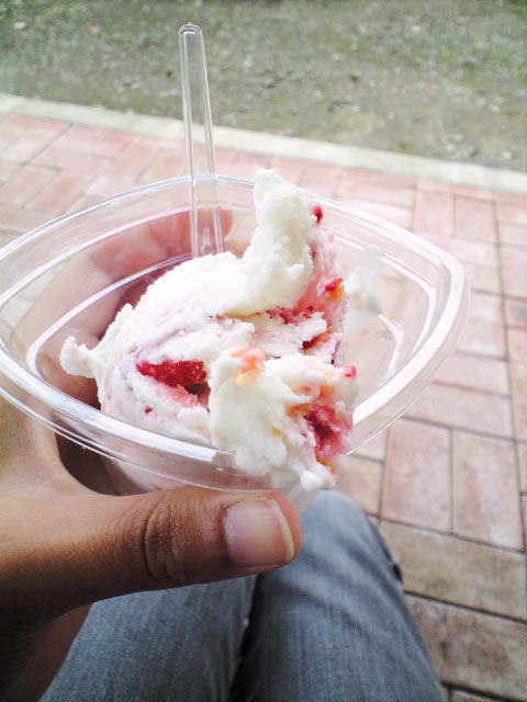 アイスの中には大きめにカットされたイチゴの果実が練り込まれていました。イチゴは凍っていて、シャリシャリ。