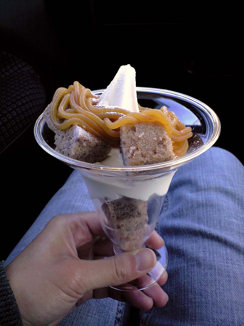 パフェの底には正方形のマロンケーキ。こちらは甘さ控えめで、ソフトクリームと一緒に食べると凄く美味しい!パサついた感じはありますが、それほど気になりませんでした。