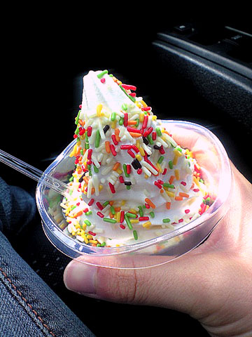 コーンフレークの入ったソフトクリームは、コーンフレークの上にソフトクリームが乗せられている、という事が多いのですが、ここはカップの下方で、ソフトとコーンフレークがうまい具合に絡まっていました(ソフトとソフトの間にフレークが挟まっていたのかな)。最後にコーンフレークを持て余しがちな私にとってはうれしい盛り方!!