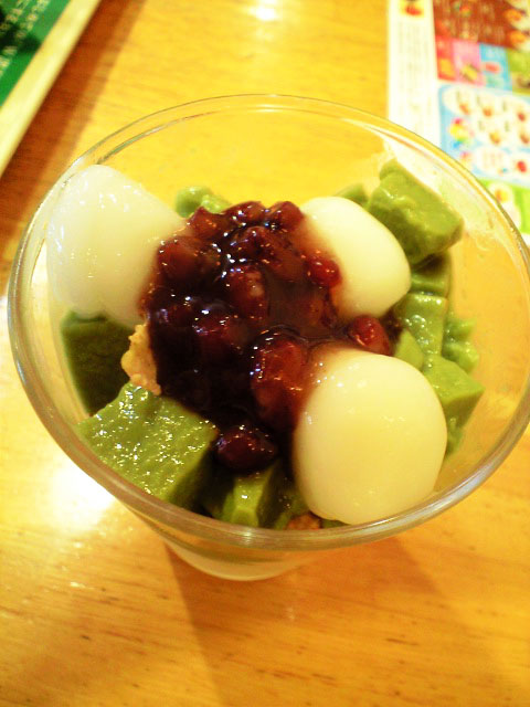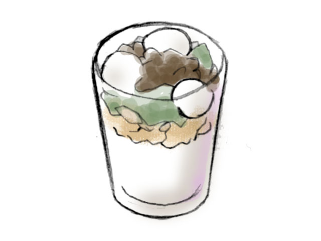 上から、小豆(あんこ)、白玉、玄米茶プリン、玄米フレーク、バニラシェイクです。