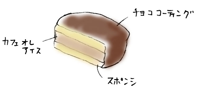 スポンジにサンドされているアイスは、甘さ控えめで程よいカフェオレ風味。表面のチョコの味が濃いので、カフェオレの味はそれほど目立ちませんが、これはこれでバランスが取れていて良い!!