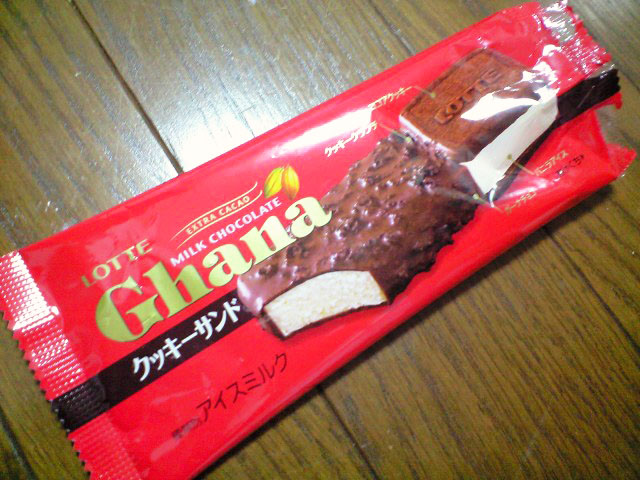 パッケージの写真はイメージなのかと思ったら、全く同じ形状の物が入っていました。 上半分は、バニラアイスにチョコクランチ入りのチョココーティングがしてあります。チョコはガーナだけあって、甘さもチョコ度も高め。バニラアイスはスッキリとした味わいの物です。 下半分はチョコクッキーサンド。ザクザクと言うほどではありませんが、そんなにしっとりしすぎている訳でもなく、食べやすい堅さです。中のアイスは上半分と同じ物。 見た目のインパクトはありますが、味は癖無く美味しいです。1つで2つのアイスが楽しめる感覚もなんだか贅沢だし、棒付きのアイスは、ちょっと食べづらいなぁと思っている私にとっては、嬉しいアイス。 これから取り扱い店舗が増えてくれるといいな。 ★★★★★ 応援クリックお願いします! ーーーーーーーーーーーーーーーーーーーーーーーーーーーーーーーー <ガーナ クッキーサンド/Family Mart限定商品 *ロッテ> ¥126/221kcal 全国のコンビニやスーパーなどで期間限定で販売中 ーーーーーーーーーーーーーーーーーーーーーーーーーーーーーーーー