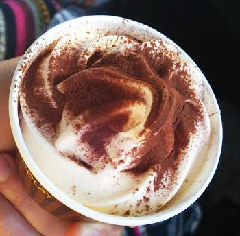 手のひらサイズのカップに入ったソフトクリーム。上にはココアパウダーがかかっています。