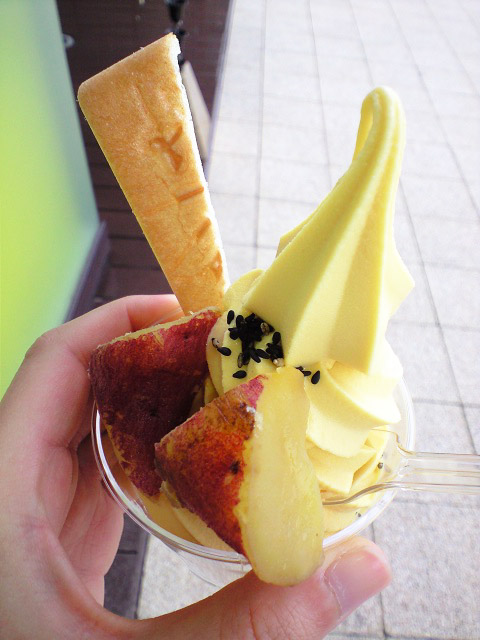 ソフトクリームは金時芋風味で、なんだか凄く冷たく感じました。固めだったので、よーく冷えてたのかな。トッピングで胡麻もかかっていました。